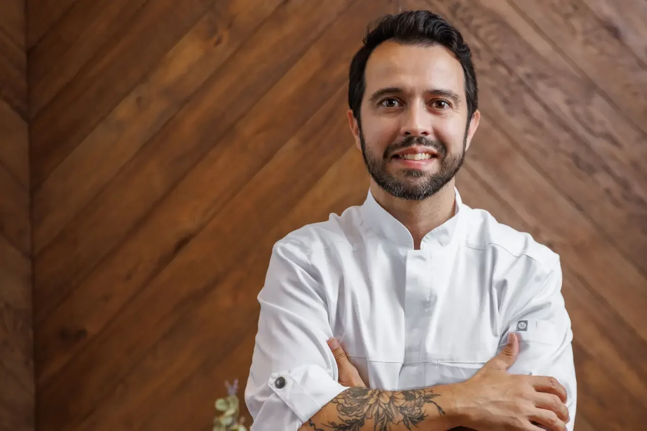 Pedro Pinto, responsável pela cozinha do Viceroy at Ombria Algarve, Prémio Revelação 2025 na categoria Boa Cama para o Guia do Expresso, traz do Barrocal Algarvio um “Taco de escabeche, porco preto no carvão, pickles e spicy dip de cenoura algarvia”.